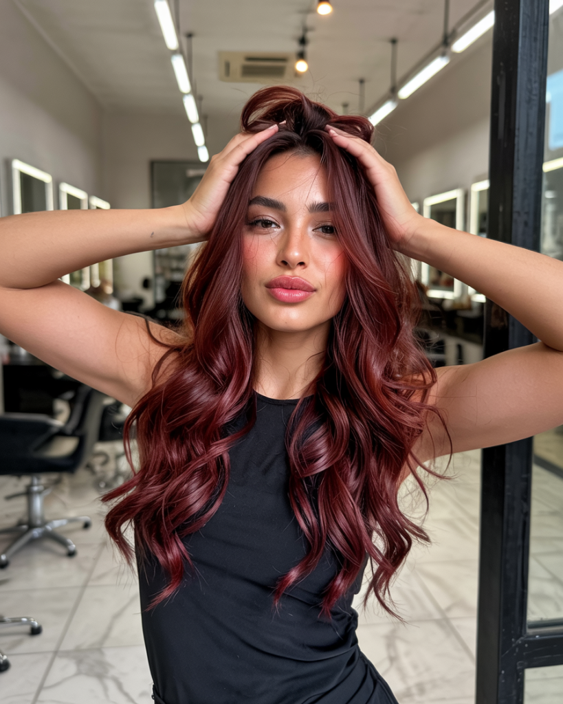 Nothing can be quite as dramatic as rich burgundy brunette when the style is cascading curls. The deep red undertones reflect the light to gorgeous effect, sparking red-wine to cherry depending on the angle. This is daring, glitzy and just right on track of fall 2025 when jewel-tone colours will reign in both fashion and beauty circles.