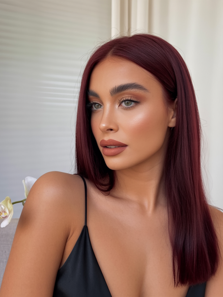 A touch of drama and polish can be yours with this sleek brunette in burgundy, dark and alluring. The enriched red undertones are a bang when exposed to natural light to give them this firm, sexy appeal. It is a daring and modern design that would work better during fall of 2025 when jewel tones are in charge.