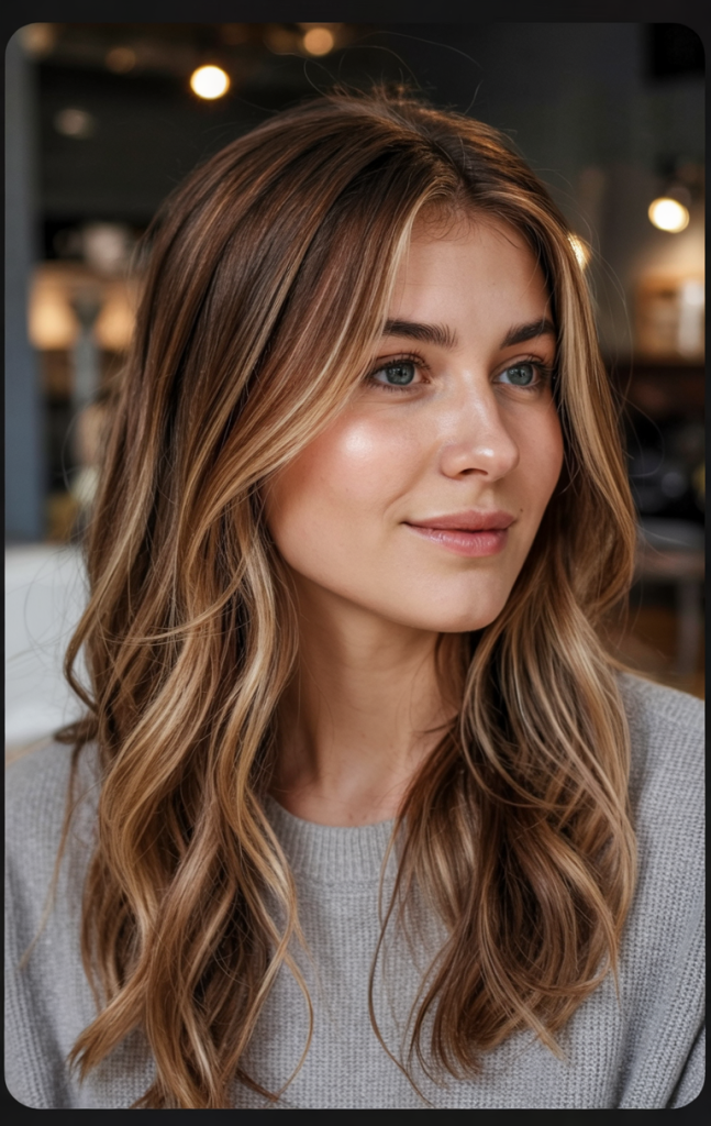 Warmth and radiance are given to classic brown hair by golden brunette waves. The golden pigments shimmer under any light, giving off a sun-kissed healthy glow that is ideal in fall highlights of 2025. It is soft, feminine, and is flattering on all ages and on all skin tones.