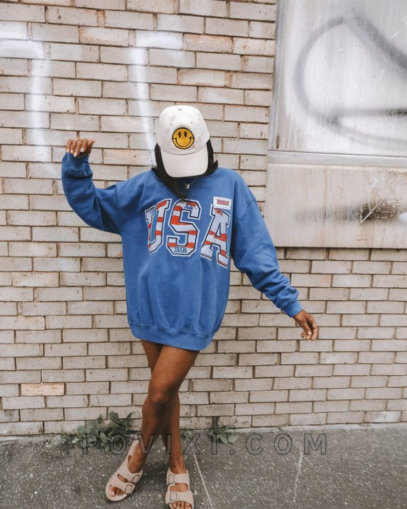 If you’re planning to stay out late to watch the fireworks or heading somewhere with a cooler climate, this look is for you. An oversized blue USA sweatshirt provides a cozy yet chic way to celebrate. Paired with neutral sandals and a baseball cap, this outfit embraces a relaxed yet festive vibe. It’s perfect for women who prefer a subtle take on Independence Day fashion while staying warm and comfortable. If you want to dress it up a bit, swap the sandals for white sneakers and add a crossbody bag for a sporty-chic feel.