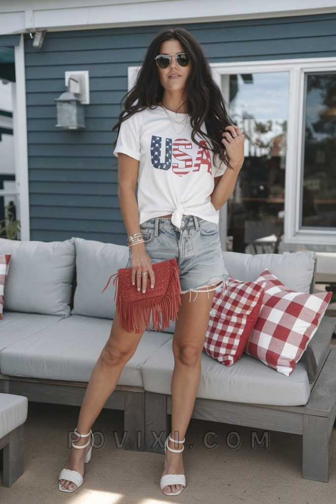 This white USA T-shirt, knotted at the waist, is a timeless 4th of July staple. Paired with high-waisted denim shorts, the outfit feels effortlessly put together. The red fringe clutch adds texture and a boho-inspired touch, while white sandals keep the look light and summery. Perfect for a relaxed occasion like a family gathering or a day spent at the lake. Accessories like layered gold jewelry and aviator sunglasses complete the outfit with an elevated touch.