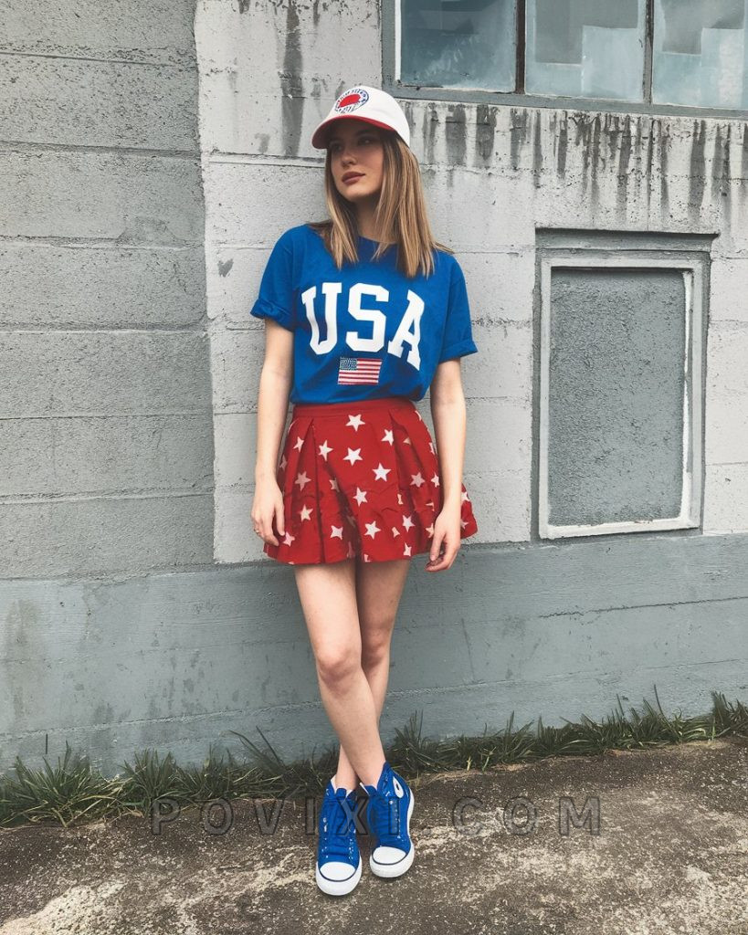 For those who love to make a statement, this bold and playful outfit is a great pick. The blue USA tee tucked into a red skirt covered in white stars creates a fun and festive look. Blue high-top sneakers keep it comfortable while maintaining the all-American theme. Add a baseball cap for a sporty twist or swap for a headband if you want to accessorize further. Perfect for teenagers and young women who love a flirty, energetic outfit for the holiday.