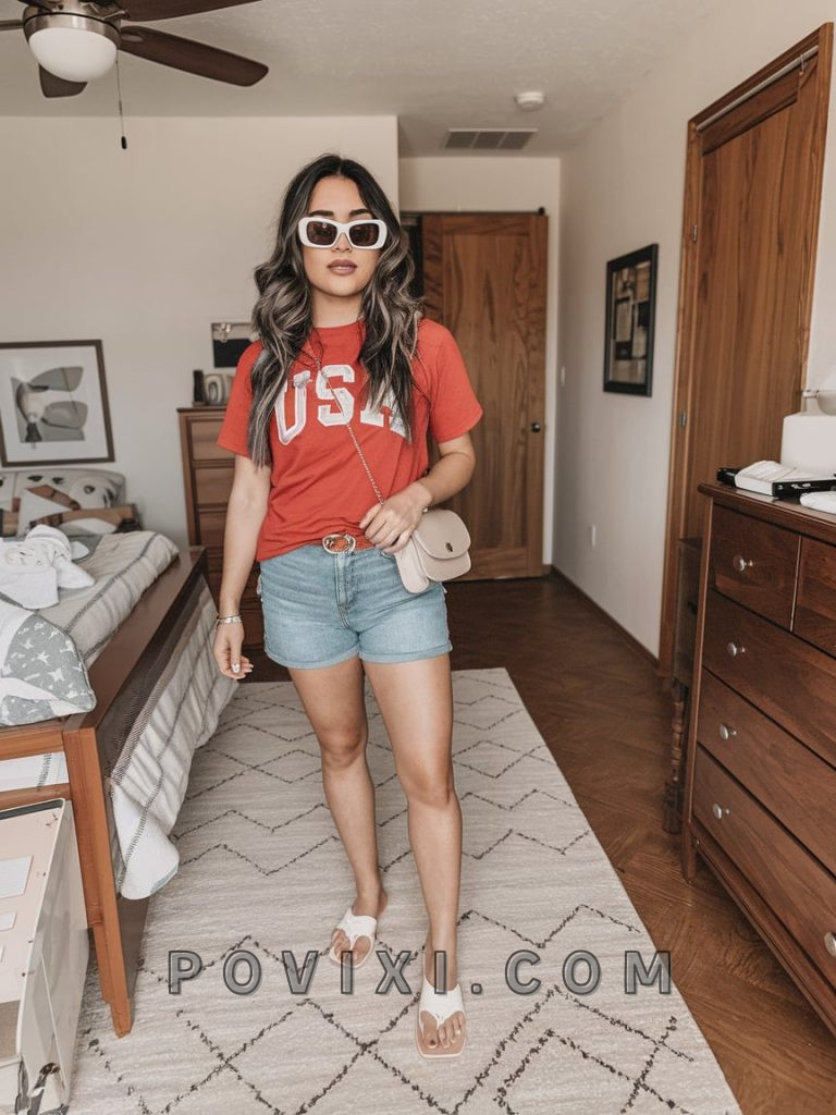 A red USA tee is always a classic, but when paired with denim shorts and white accessories, it becomes a modern patriotic statement. White slides, bold sunglasses, and a crossbody bag keep the outfit sleek and contemporary. Ideal for women in 2025 who want an updated and effortless take on 4th of July fashion.