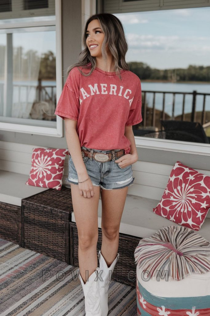 If you’re a fan of boho and western aesthetics, this is the outfit for you. A faded red “America” tee styled with distressed denim shorts and cowboy boots creates a stylish, country-inspired look. The Western-style belt buckle is the perfect accessory to complete the outfit. This look is great for outdoor concerts, campfire gatherings, or even a rodeo-inspired celebration.