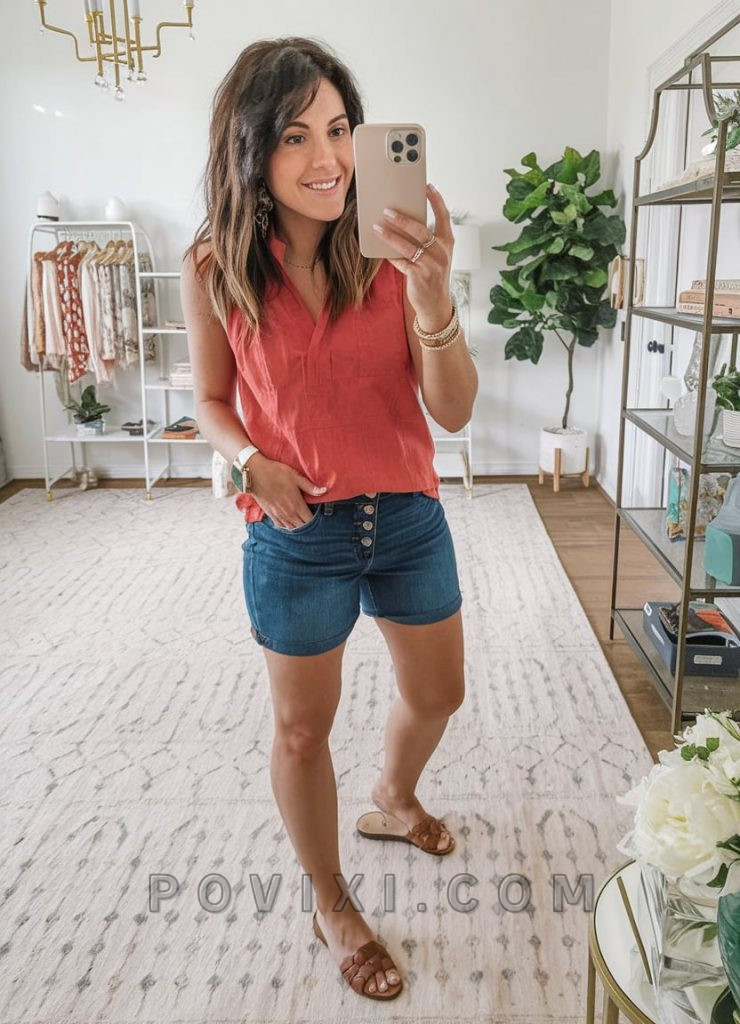 For women who want a subtle yet elegant outfit, a red sleeveless blouse paired with denim shorts is a perfect choice. It’s for women 2025 who love a chic, understated holiday look. Add woven sandals, gold bangles, and a straw tote bag for a polished yet easygoing outfit. Perfect for a brunch date, a family gathering, or even a more dressed-up 4th of July dinner.