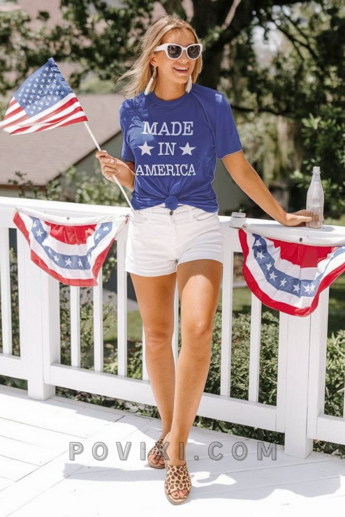 If you love bold yet simple looks, this blue “Made in America” tee is a great statement piece. Knotted at the waist and paired with white shorts and leopard-print espadrilles, it strikes the perfect balance between casual and festive. Retro sunglasses and statement earrings elevate the outfit, making it a fun choice for women who love accessorizing.