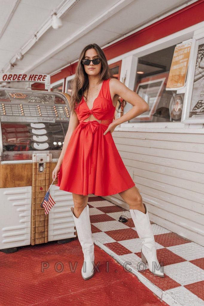 A stunning red dress is the ultimate 4th of July inspo. This look is perfect for women who love to make a statement with a bold yet feminine style. The sleeveless cut and tied front detail give a subtle yet flirty touch, while the white cowboy boots add a fun, boho twist. The key to rocking this look is confidence. Red is a color that commands attention, making it ideal for standing out at a for women party or gathering. If you want to make the look even more striking, opt for bold accessories such as statement earrings or a structured white handbag. Pair this with oversized sunglasses and delicate accessories like a dainty bracelet to complete the look.