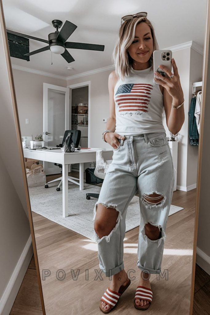 For a laid-back yet stylish vibe, go for a classic American flag tank with ripped jeans. The sleeveless top makes it perfect for warm weather, while the distressed denim adds an edgy, casual aesthetic. For women who want to keep it low-key yet festive, this is the go-to outfit. This look is perfect for outdoor celebrations, where comfort meets style. The distressed jeans add a rebellious edge, and the tank top keeps things light and breathable. If you prefer a preppy look, swap the ripped denim for crisp white shorts or a flowy maxi skirt. Elevate this casual look with striped slides and gold accessories for a chic touch.