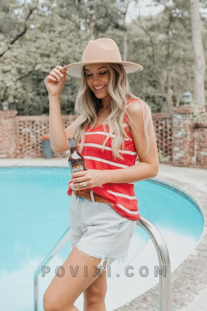Nothing says summer inspo like a crochet striped tank in red and white, paired with light-wash denim shorts. This breezy look is ideal for the beach or a relaxed holiday weekend outdoors. Perfect for women 2025 who want something light and breathable, this outfit allows you to move freely while still looking effortlessly stylish. The knit texture gives it a vintage feel, and the soft denim adds comfort. Complete the outfit with a boho-inspired hat and minimal accessories for a laid-back yet chic feel.
