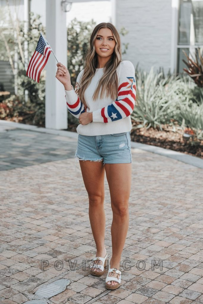 For those cooler 4th of July evenings, a patriotic sweater paired with denim shorts is both stylish and practical. The stars and stripes print brings the festive spirit without being over-the-top. A versatile outfit that works for daytime and nighttime celebrations, this look pairs well with casual sneakers or chunky sandals. Add a headband for extra flair, and consider layering with a denim jacket if the evening gets chilly. Keep it casual with white sandals and delicate gold accessories.