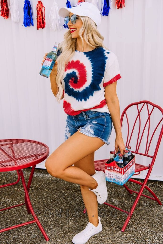Nothing says 4th of July inspo like a tie-dye tee in patriotic hues! Paired with denim shorts and white sneakers, this look is fun and youthful—ideal for teenagers or those who love a lively twist on festive fashion. Complete the ensemble with a baseball cap and sunglasses for a sporty, all-day-ready vibe. This is a great option for outdoor festivals or casual BBQs where comfort is key. Plus, tie-dye is a hot trend for women 2025, making this outfit both stylish and fun.