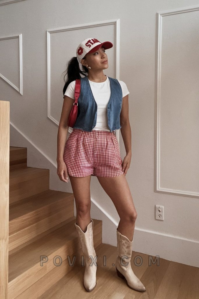 For those channeling a boho western aesthetic, this outfit is a showstopper. A red-and-white gingham print short paired with a denim vest and cowboy boots creates a standout look for a country-themed Independence Day event. Add a red baseball cap for a sporty-chic balance, and you’ve got a trendy for women outfit that’s both stylish and comfortable. This look also works well for a rodeo event or outdoor concert. Add a straw hat and some layered accessories to elevate the Western-inspired feel.