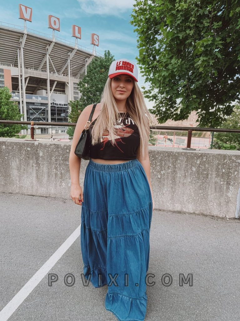 This breezy, relaxed look is perfect for outdoor festivities. A black graphic crop top paired with a flowy denim maxi skirt blends comfort with edgy style. This is a for women 2025 look that works from beach picnics to concert nights. Add a red cap and gold hoops to tie it all together. The flowy silhouette makes it great for dancing, moving around, and staying cool in the summer heat.