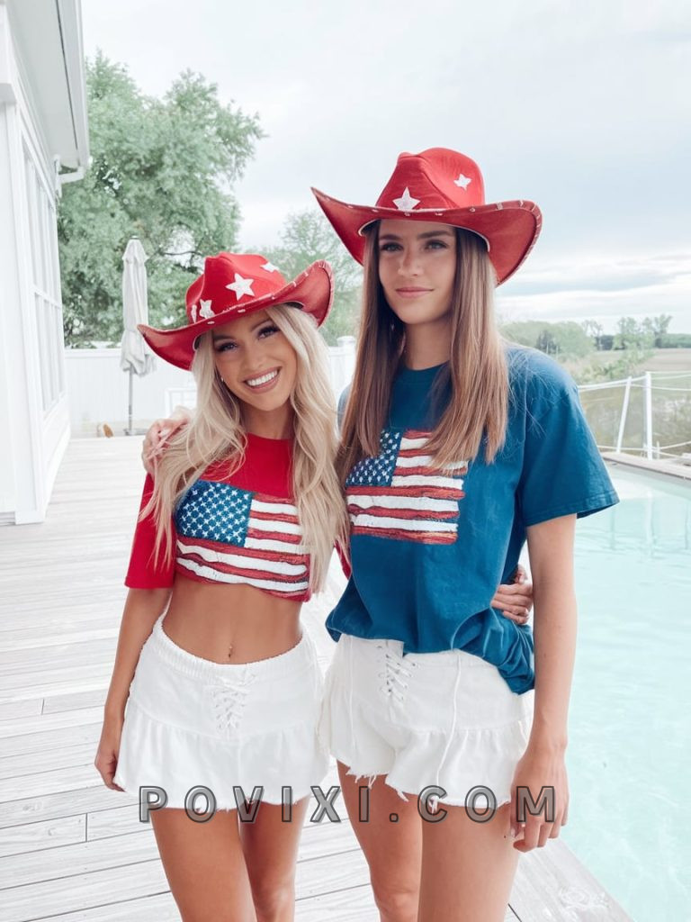 Coordinating outfits are always a good idea! This dynamic duo rocks American flag crop tops with ruffled white shorts, creating a fun, youthful look. Perfect for teenagers or besties celebrating together, this look is cute and super Instagram-worthy. Accessorize with cowboy hats and bold lip color for a trendy, festive touch. If you’re heading to a party, complete the look with ankle boots or platform sandals for a chic twist.