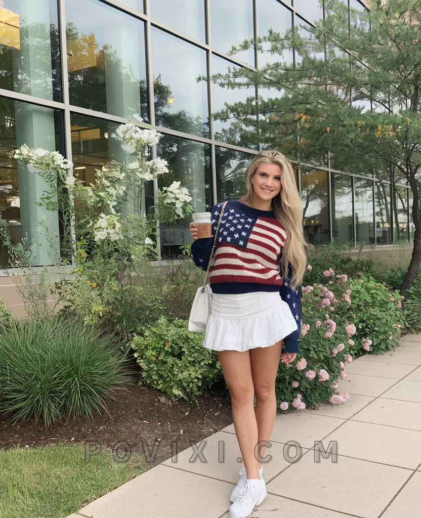 For cooler evenings, this aesthetic stars-and-stripes sweater paired with a ruffled white mini skirt offers the perfect balance of comfort and style. Whether you’re watching fireworks by the lake or heading to an upscale celebration, this look is versatile and effortlessly chic. Add white sneakers and a crossbody bag to complete the ensemble. If you prefer a boho feel, swap the skirt for a pair of wide-leg pants and layer on some chunky accessories.