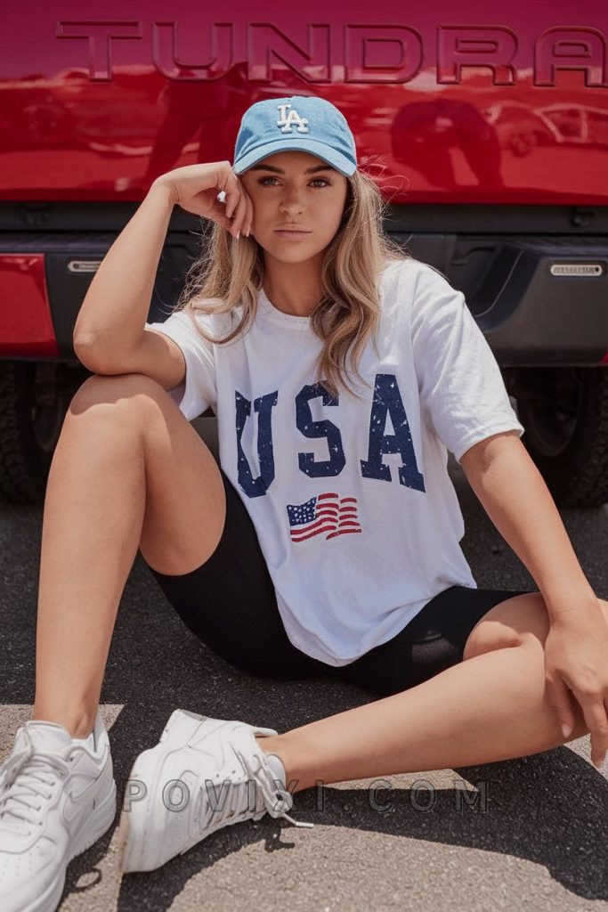Athleisure meets patriotism with this bold USA tee and black biker shorts combo. Ideal for women who prioritize comfort, this outfit is perfect for an active day spent at a beach gathering or a festival. A blue baseball cap adds a pop of color, keeping the look sporty and effortless. If you’re planning to be on the move all day, swap the sneakers for chunky sandals or stylish slides for a more laid-back feel.