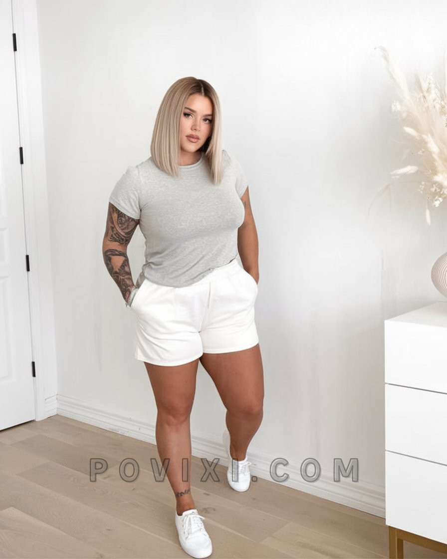 A simple yet stylish look featuring a soft gray fitted T-shirt tucked into white tailored shorts creates an effortlessly chic summer vibe. This outfit is perfect for a casual mom running errands or meeting friends for coffee. The clean, monochromatic aesthetic is fresh, modern, and breathable, ideal for warm weather. White sneakers complete the ensemble, ensuring all-day comfort.