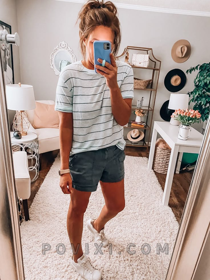 A striped T-shirt with casual drawstring shorts and white sneakers is a no-fuss, relaxed weekend look. Ideal for running errands or enjoying a low-key summer day, this outfit is the epitome of casual mom fashion. The lightweight fabrics ensure comfort, while the monochrome aesthetic keeps it stylish. Add a pair of aviator sunglasses and a canvas tote for an easygoing summer vibe.