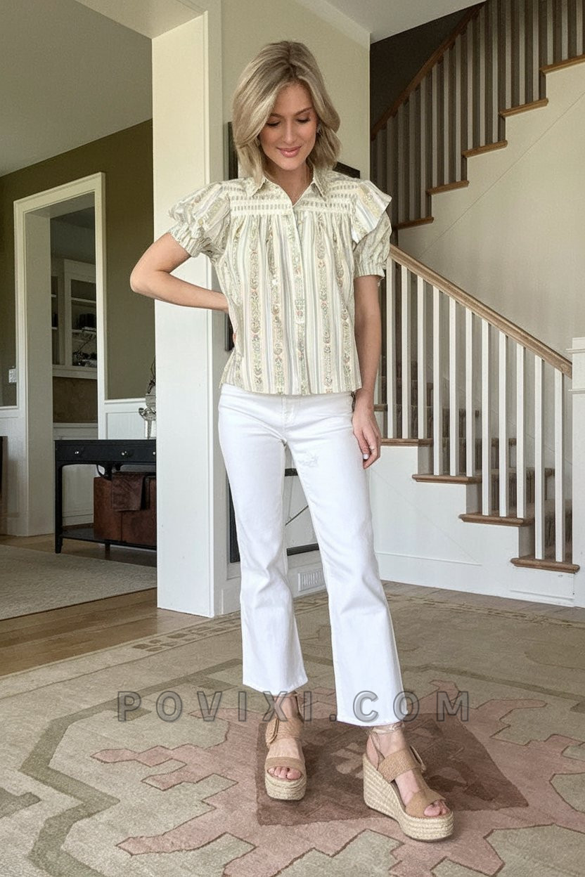 50 casual fashion over 40 means embracing light fabrics with flattering silhouettes. A puff-sleeve blouse adds a vintage touch, while the white cropped jeans create a casual chic statement. Paired with neutral espadrille wedges, this is a versatile look that transitions from day to night effortlessly. Tuck in the blouse and add a belt for a more structured, classy look.