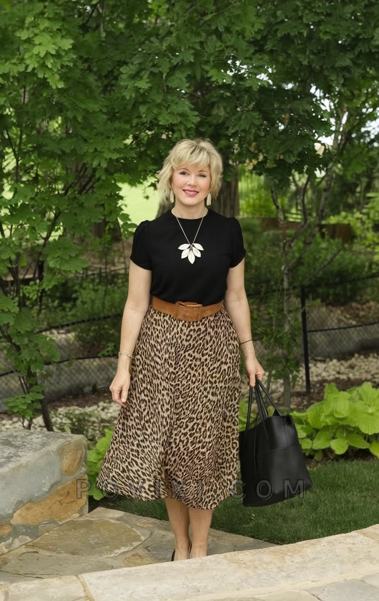 Animal prints never go out of style, and this leopard print midi skirt paired with a simple black top is a prime example of how women over 50 can wear bold patterns while keeping things sophisticated. The cinched waist with a belt accentuates curves in a flattering way. A statement necklace and structured black tote complete the look for a polished finish. Swap the tee for a silky camisole for a more elevated feel.