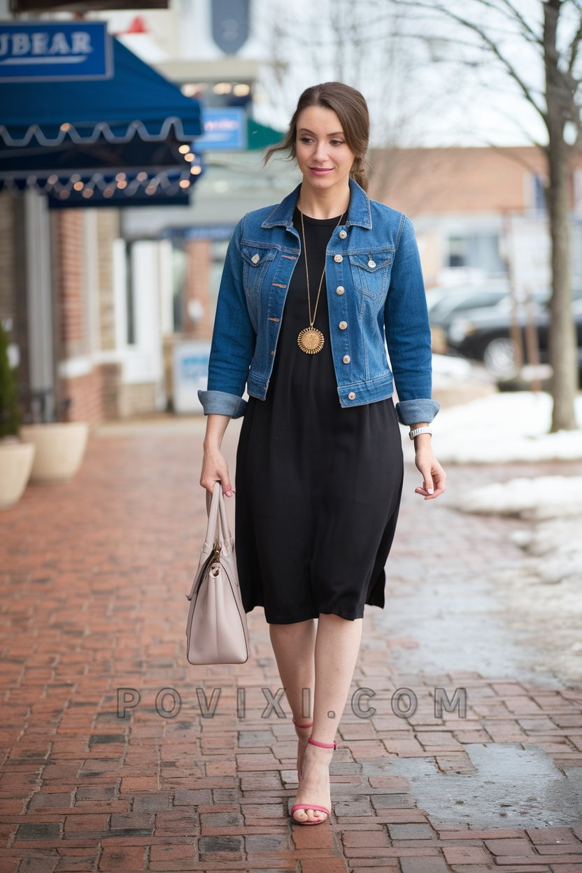 A black midi dress is a must-have in any summer wardrobe. Layered with a cropped denim jacket, this outfit is perfect for transitioning between casual and dressy. The pink strappy sandals add a playful touch, making this a cool casual chic look for dinner outings or city strolls. Swap the pink heels for classic white sneakers for a relaxed daytime look.