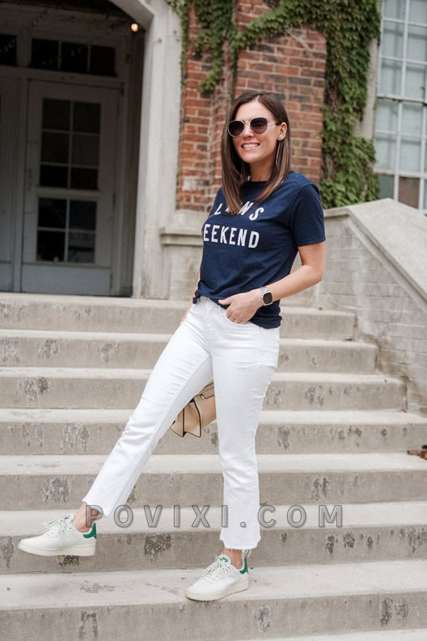 For a laid-back yet stylish look, a navy graphic tee paired with white cropped pants is the perfect weekend go-to. Whether you’re traveling, heading to brunch, or walking through a seaside town in Italy, this outfit exudes 50 casual fashion over 40. White sneakers add to the cool, relaxed vibe, while sunglasses complete the effortless look. Tie a denim jacket around your waist for an extra layer that can come in handy when temperatures drop in the evening.