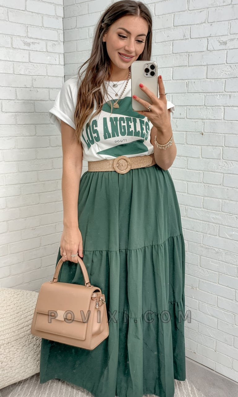 Mixing casual and feminine elements, a graphic tee tucked into a flowy tiered maxi skirt creates a relaxed yet classy look. This outfit works well for day trips, casual outings, or even Sunday brunch. The contrast of casual and dressy elements makes this a great 50 fifty not frumpy outfit. Cinch your waist with a woven belt to add structure and balance out the volume of the skirt.