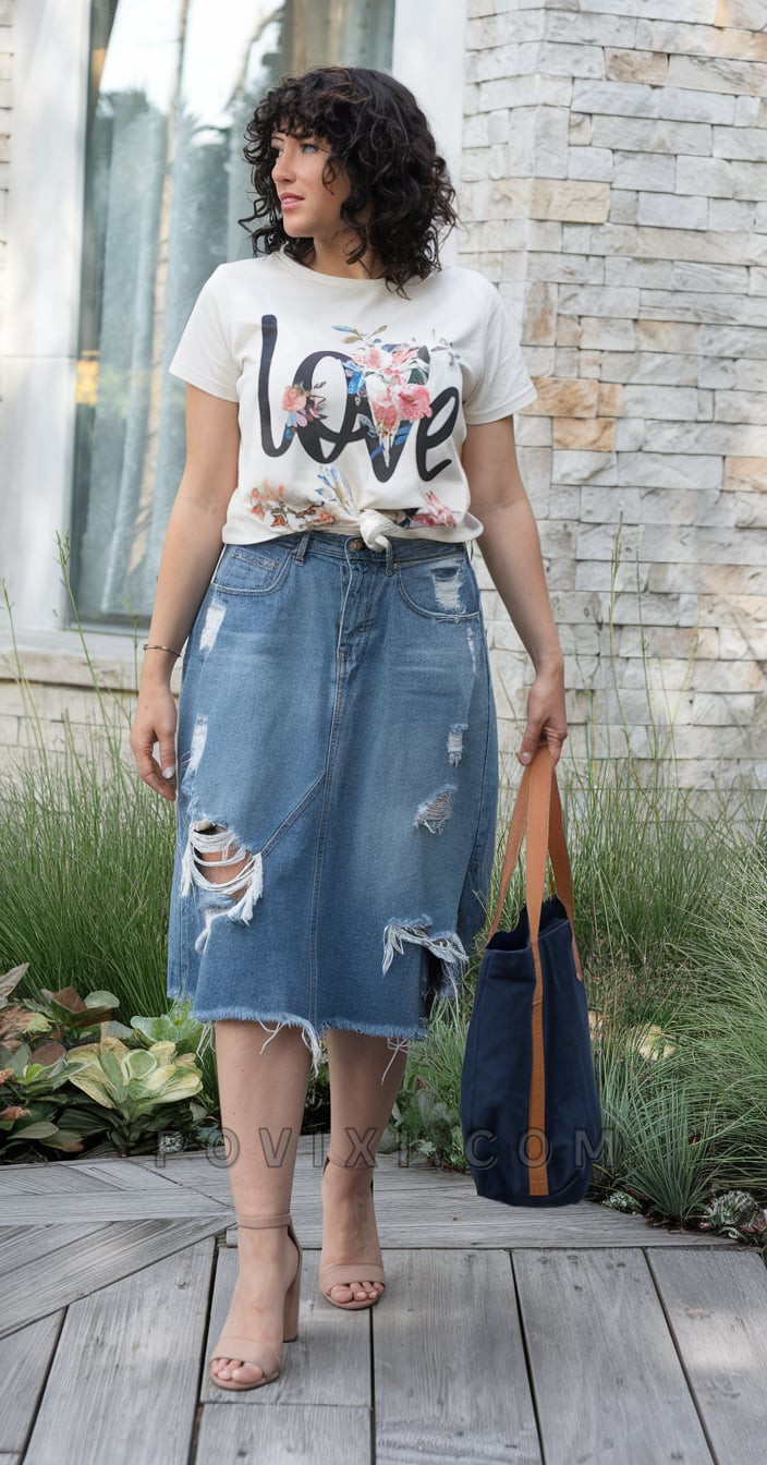 A distressed denim midi skirt styled with a knotted graphic tee is the epitome of modern casual chic. This look is perfect for weekend shopping trips or casual gatherings. The raw hem on the skirt adds a touch of edginess, while the knotted tee creates a flattering silhouette. Style this look with strappy sandals and a tote bag for an easy yet stylish summer outfit.