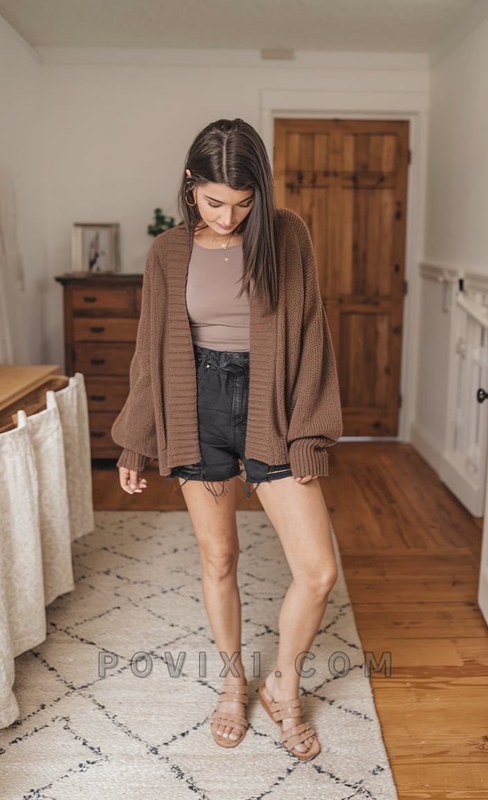 For those cooler summer nights, layering is key. A brown oversized knit cardigan over a fitted tank and black denim shorts creates a cozy yet fashionable ensemble. The muted tones add a touch of sophistication, making it perfect for 50 fifty not frumpy fashion lovers. Neutral sandals maintain the casual vibe while keeping it effortlessly stylish.