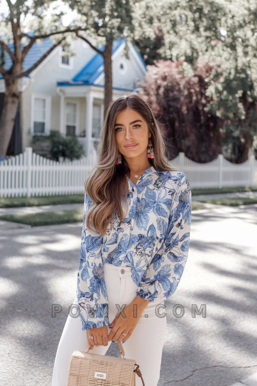 A lightweight blue floral blouse tucked into white jeans exudes feminine elegance, perfect for brunch or a stroll through the city. This outfit seamlessly blends casual chic with refined simplicity, ideal for summer days when you want to feel polished yet relaxed. A woven handbag and statement earrings complete the effortless European summer aesthetic.
