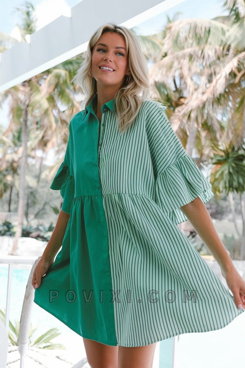A two-tone green summer dress with striped detailing is an effortlessly chic choice for warm weather. The playful yet sophisticated cut ensures comfort while maintaining a polished feel. This is a great pick for beach bathing suits bikinis cover-ups or casual summer outings. Pair with espadrille sandals and a straw hat for an added vacation-ready touch.