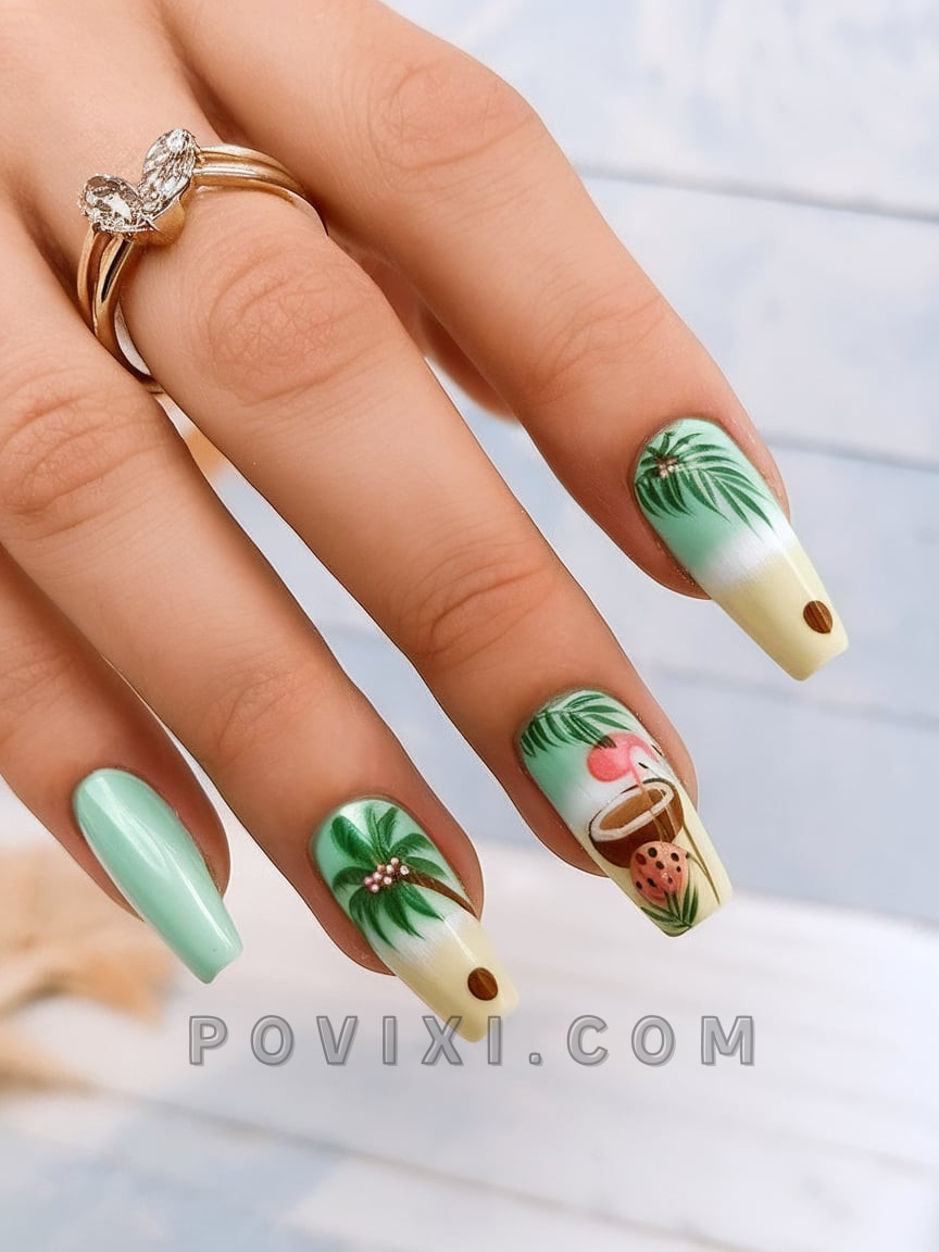 This gorgeous nail art features vacation-style artwork with hand-drawn palm trees and coconut decorations, as well as a flamingo sipping a cocktail. The ombré background uses soft mint and ivory tones to create a beach-themed feel that brings together fun and relaxing elements. This coffin nail length is a perfect pool-ready design that creates a tropical 2025 feel for any beach event. Accompanying this design with tiny glitter details adds to the look without taking away from the original natural appeal. You will experience a true summer paradise when you wear these nails on your fingers.