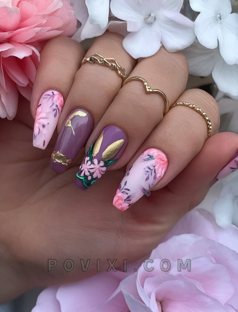 This near-perfect set features floral designs paired with gold-leaf rabbit ear details in pastel pink and mauve shades suitable for spring through summer. A natural look prevails despite the high level of detail in this design. The elegant attitude of these acrylic nails shows mainly European style, which is suitable for all outdoor events, including family celebrations and walks through gardens besides romantic dates. These nails offer a beautiful 2025 feminine style along with elegant charm.