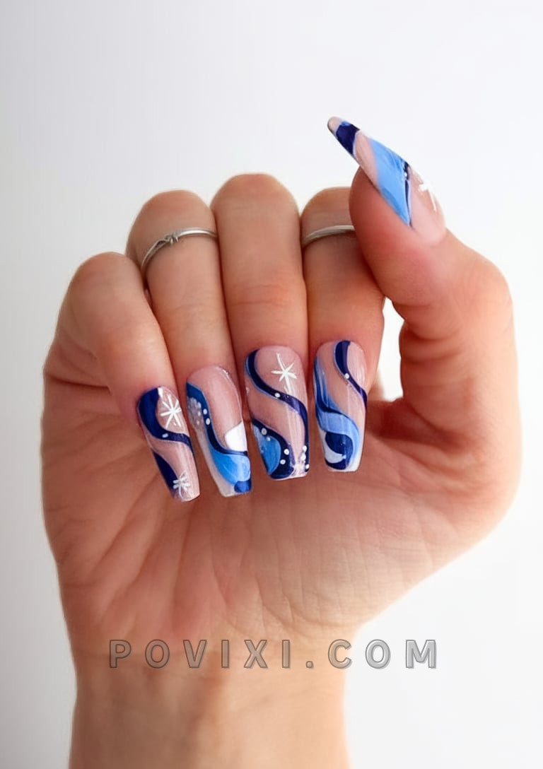The bold shape of Coffin Nails is brought to life by the cosmic blue color combination that creates a wave-like effect. The nail design showcases a beach vacation mood by combining natural nails with flowing lines that feature tiny white star embellishments for an adorable sparkle. The blues blend smoothly with the white dots to create a rhythm that together exudes funky elegance. This nail design is perfect for sundresses and casual beach outfits.