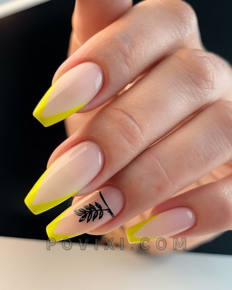 This contemporary French style combines minimalist elegance with bold color. The medium length style gets its vibrant character from a clean yellow border on the fingers, while the single leaf design on the ring finger adds a formal and trendy element. The style serves as an ideal choice for individuals who require a clean aesthetic that retains visual power in sunny summer conditions.