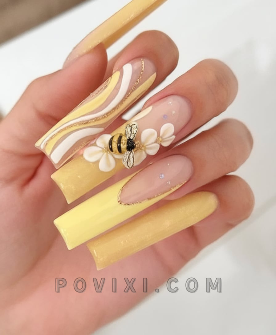 The list features this delightful nail art that uses a 3D bee to decorate translucent flowers over a base that turns soft yellow and then nude. The combination of the soft yellow base with nude nails and sculpted daisies turns this design into a lovely flower garden dream. The design is for acrylic wearers who want spectacular jewelry effects without excessive embellishment. Think picnic-ready and perfectly Instagrammable.