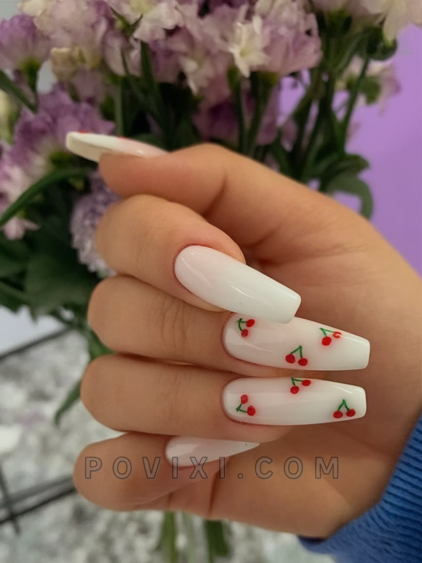 The basic style shows how shopping for short coffin nails does not mean sacrificing fashion impact. The combination of qualified cherries against a white glossy surface elevates retro concepts to contemporary times, offering both childlike and vibrant compositions. The look is perfect for summer brunches and afternoon market strolls as it works perfectly with both natural and dip nails.