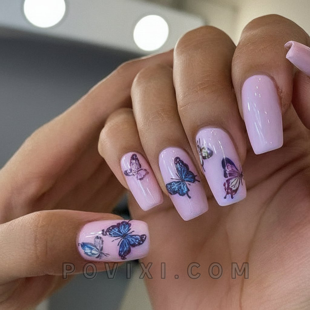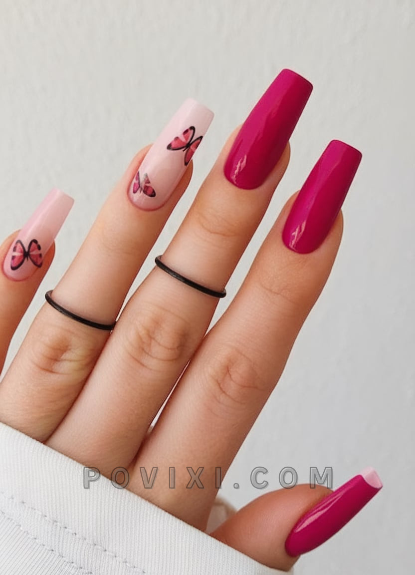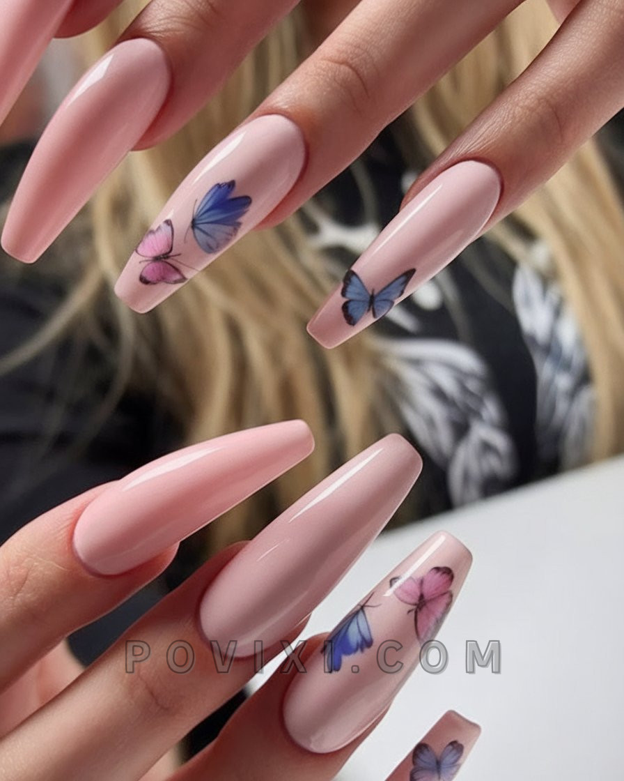 This design is for those who want a romantic and whimsical yet pretty look. The design features butterfly wings stretching across two nails that feature purple and black colors, while the rest of the nail has a simple pink shine. This combination creates a striking, delicate look. Two options of medium coffin nails provide a relaxed, natural look while adding a unique artistic flair to garden events and brunch gatherings. Butterfly nail art remains popular for the current 2025 season.