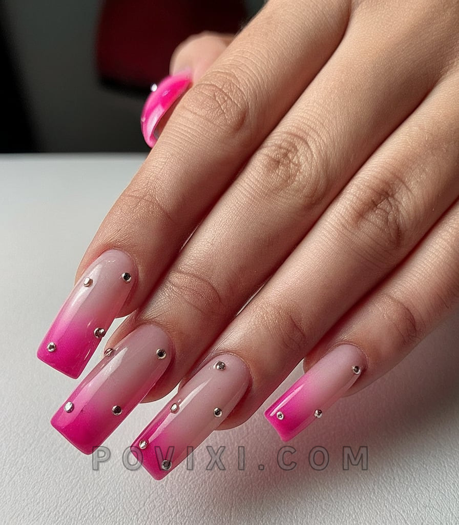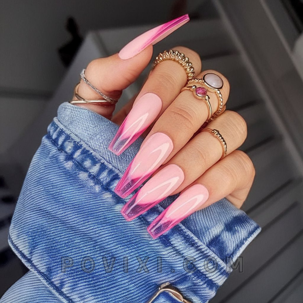 Braving summer in style calls for the vibrant pink and white color combination known as ombre. Acrylic nails stretch to a fuchsia gradient that transitions from nude to bright pink, while randomly placed rhinestones create spectacular sparkles. This nail design perfectly blends daytime pool relaxation with nighttime elegance, projecting a bold future style for 2025.