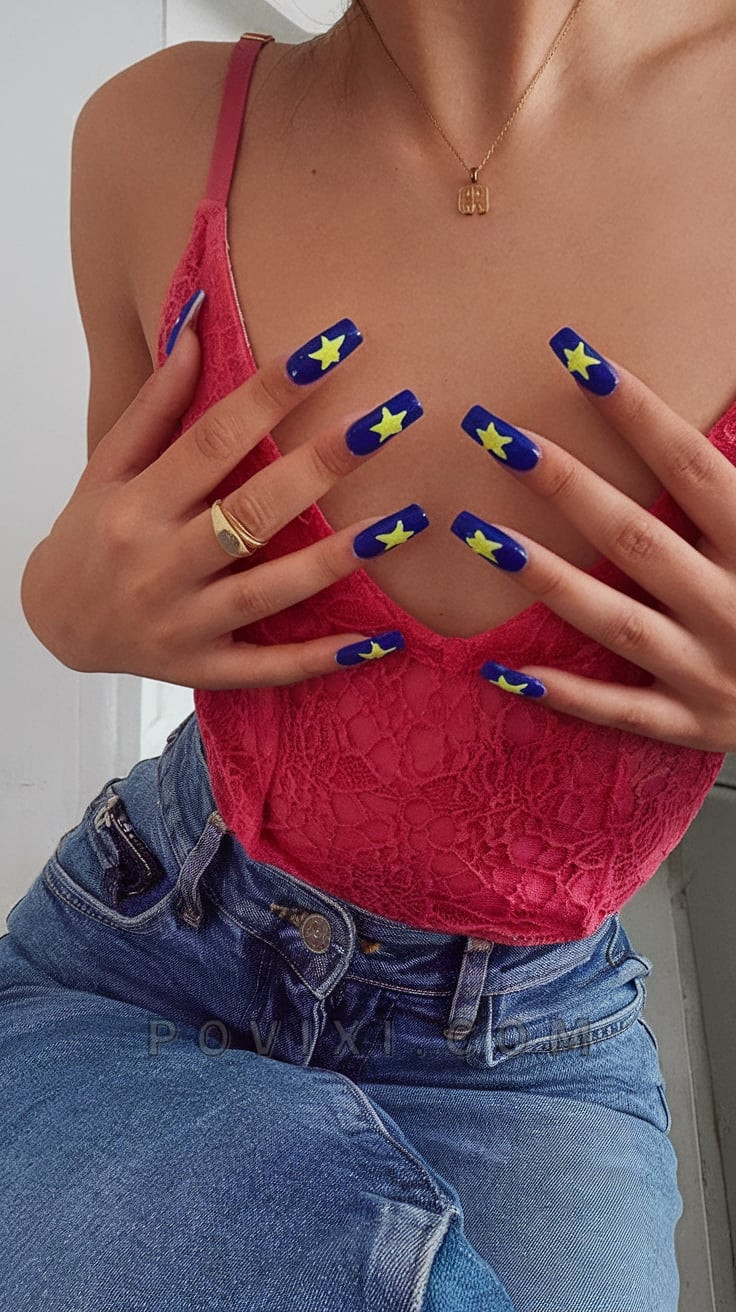 The combination of vibrant yellow stars on a navy blue nail looks bold. The nail design offers a vibrant cosmic fashion that pairs beautifully with denim or stands out as the top layer of a statement outfit. The playful yet confident vibe of this design is perfect for women who want to express their vibrant summer spirit without restraint.