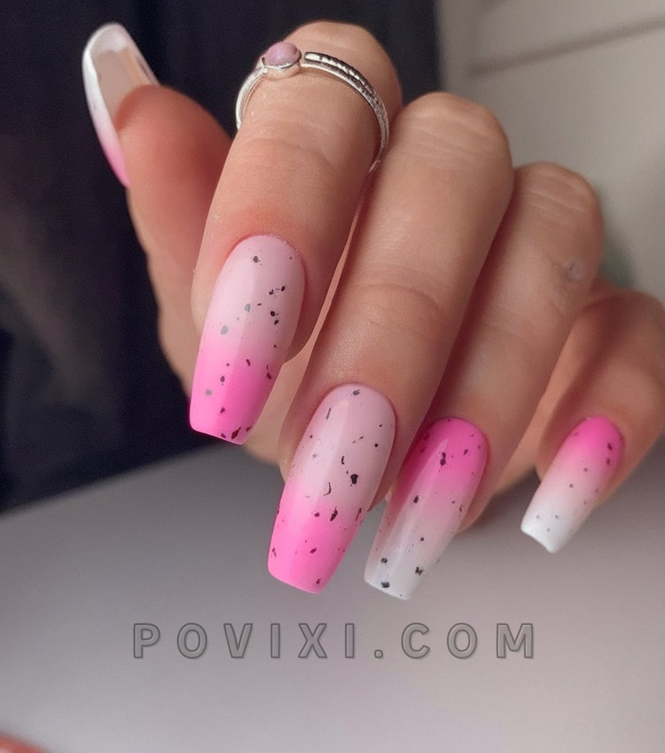 This creative nail design uses color effects and textural elements in a distinctive dip technique. The nail color fades from soft white to bright pink, while small black dots add an artistic touch to create a unique design. This style works well for women who prefer edgy looks with a polished touch. The short finish with a square shape creates both utility and fashion appeal.