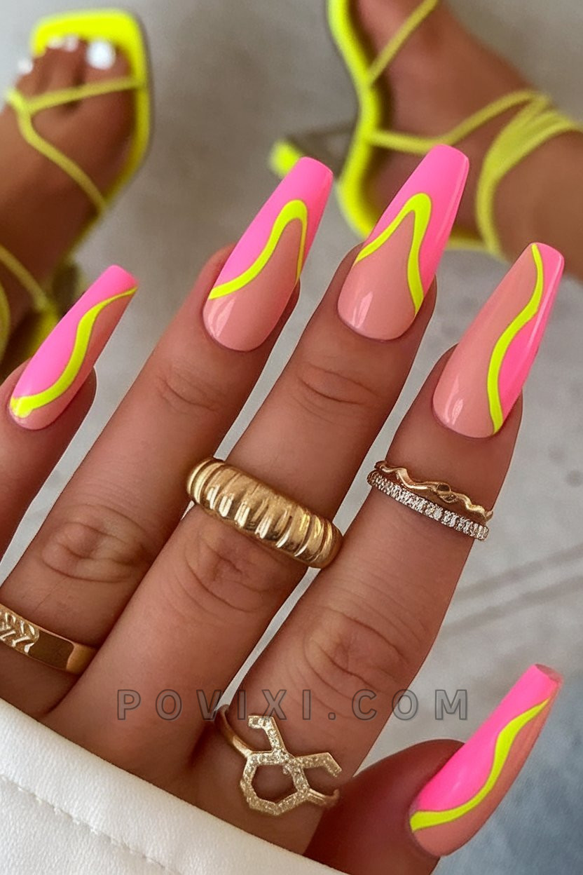 Ultra-bright, colorful swirls create a playful encounter with bold elements. This design features a glossy nude base and vibrant hot pink and electric yellow stripes that create an exciting, edgy and funky effect. These long coffin nails stand out dramatically and work best for festival events and lively evening occasions. Long coffin nails radiate youthful energy when worn with strappy sandals and gold rings that create a fashionable charm. Such statement nails are for women who refuse to hide their light among others, both visually and emotionally.