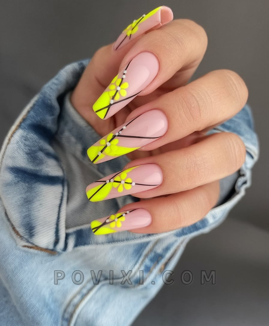This vibrant nail design creates a blend of bold colors and natural softness that works well for all occasions. A nude translucent base carries yellow floral blooms that are crossed with black lines and dotted details. This coffin-shaped design will appeal to anyone who loves a contemporary floral style with a vibrant brightness due to its medium size. The design works for both daytime coffee visits and nighttime rooftop gatherings.