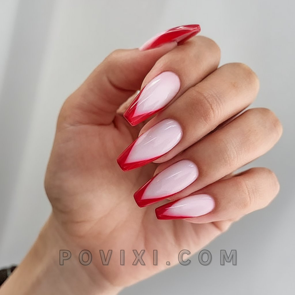 This modern take on the French twist combines diagonal lines and red color on a sheer pink ombre background. The look has an understated appeal while remaining visually striking and can be paired with both dress heels and casual sneakers. This style is for women who want a tidy appearance with subtle boldness in their designs. These nail extensions offer precise shine that demonstrates the growing minimalist fashion trend of 2025.