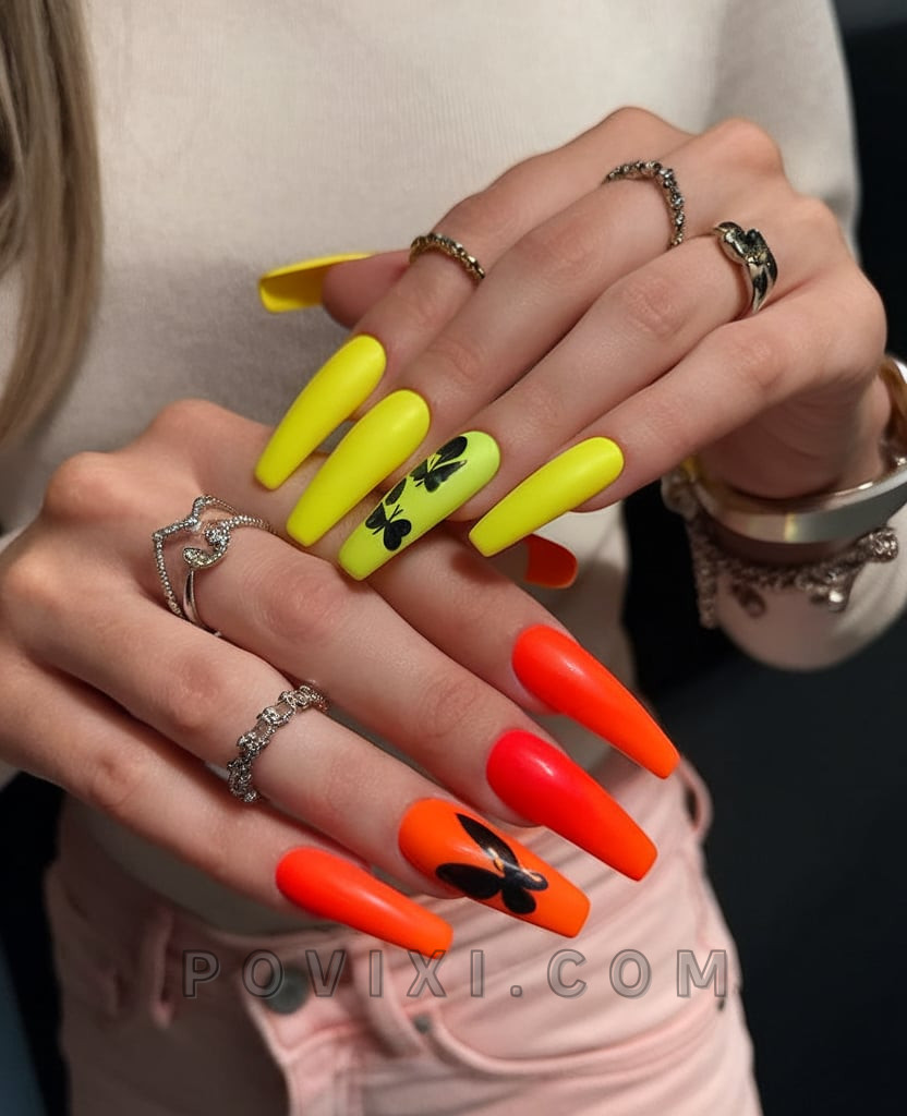 If you want strong, mood-driven nails, go for this creation. Candy orange sparkles from one hand while fluorescent yellow appears on the other as these shades reveal deep black butterfly patterns. Extended coffin nails become creative carriers of a powerful festival spirit that matches free-spirited personal styles. The vibrant glam style reaches perfection when you wear this look without reservation, letting people notice your boldness.