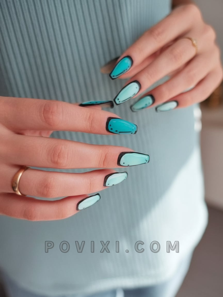 A creative vision of comic book drawings and European urban style creates this unconventional, edgy teal design that breaks away from everyday trends. The turquoise base on each nail is finished with perfect black edges that create a three-dimensional cartoon effect. This statement reflects both creative vision and personal style while working for both natural and acrylic nail extensions. Wear this nail art design with basic clothing styles so the nail art can be the main attraction.
