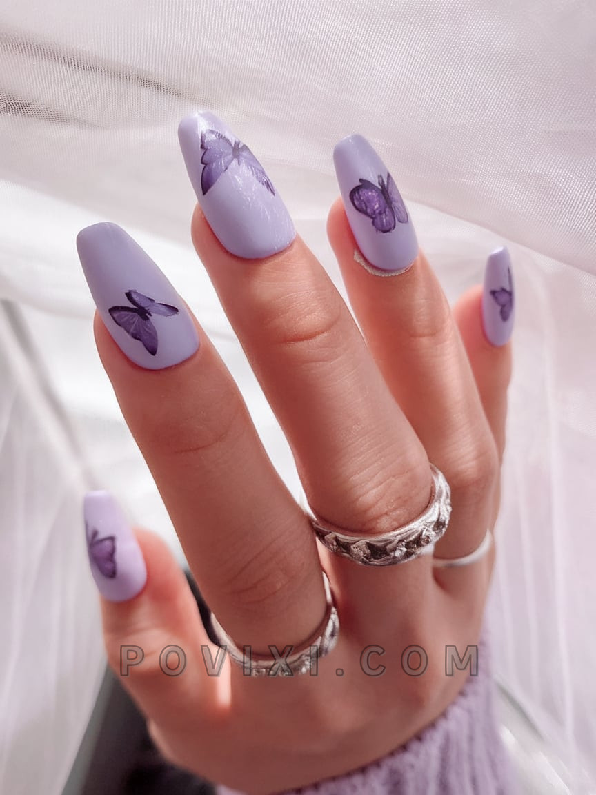 The lavender gel nail set presents a delicate and fluffy design that features elegant butterfly decals in deeper shades of purple. This fashionable spring/summer option features a pastel balance alongside delicate artwork that creates a dreamy, pretty look. The medium coffin shape provides elegant everyday wearability.