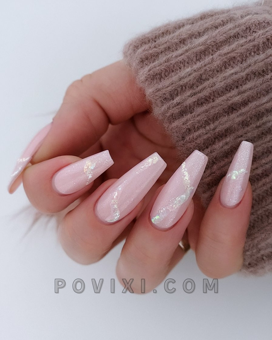 We conclude the series with a shimmering section that rounds out the list. The set uses soft shades of pink to showcase a base coated with glossy pigments that emit shimmering white veins that catch light reflections. The sophisticated finish gives the manicure a sophisticated look that would be perfect for upscale wedding events as well as baby showers and elegant summer parties. The long coffin shape enhances the overall look with effortless glamour.
