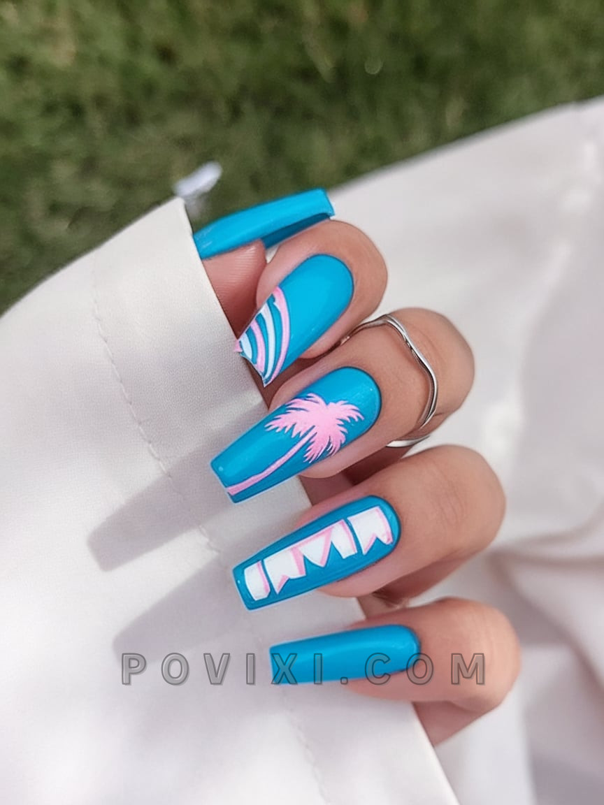 The shimmering blue coffin nails with pink accents represent the delightful spirit of summer. The design uses palm trees along with graphic elements that blend beach aesthetics with contemporary pop art characteristics. The matte finish of this design creates an editorial quality that gives it high potential as an Instagram grid-worthy look. This nail design is perfect for anyone who wants to have fun in style with artistic elements, as it perfectly blends bold elements with simplicity.