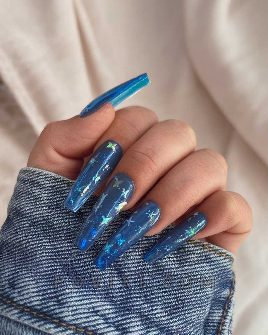 The oceanic jelly design creates a watery look that appears to have floated in from beneath the waves. The jelly nails feature a blue translucent base that contains floating glitter and rhinestone embellishments, as well as stars that create an effect of water reflected light. The gel texture adds shine while the coffin design adds drama. This seductive blue set for summer 2025 is perfect for Miami Beach beach club outings while adding an aquatic style to everyday looks.